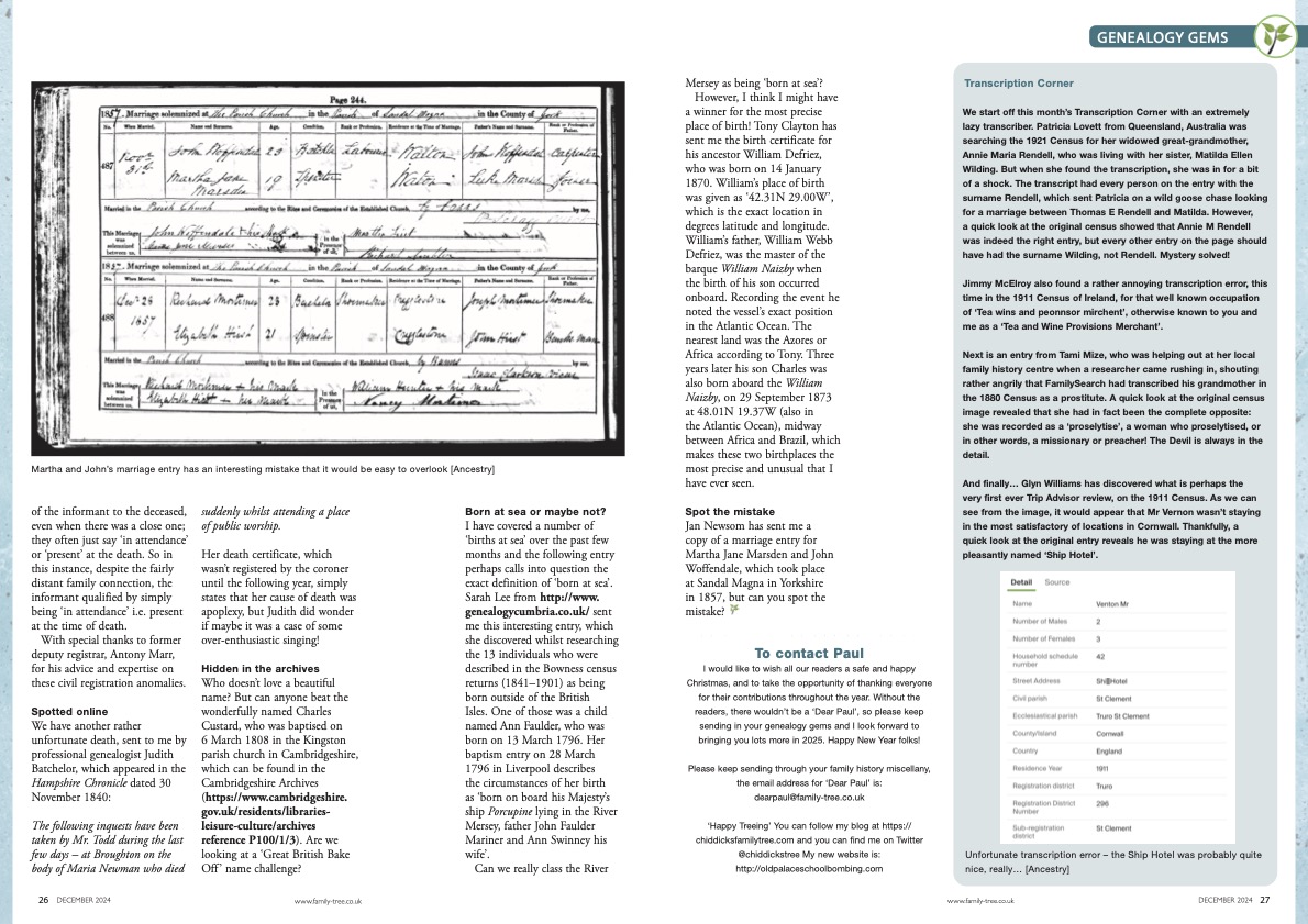 Over the years, readers have written in with everything from census oddities and eyebrow-raising parish register entries to tales of long-lost relatives reuniting under astonishing circumstances. And then there are the mysteries: the small anomalies that don’t quite make sense until you follow the clues, and inevitably you fall down one of those irresistible research rabbit holes.